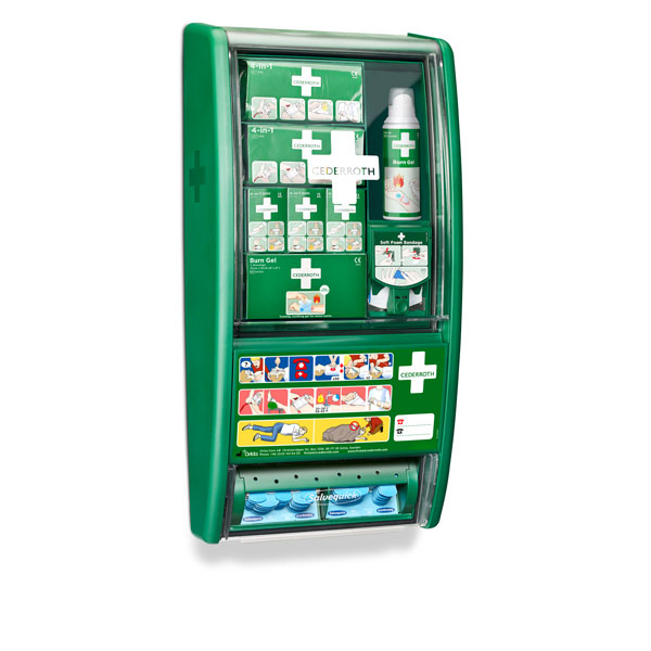 Die Verbrennungsstation ist ideal für Berufsgruppen mit erhöhtem Verbrennungsrisiko geeignet. Die Station deckt insbesondere die Bereiche Verbrennung und Schnittwunden ab. Sie wird an der Wand befestigt.