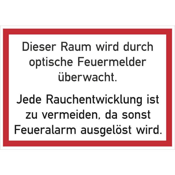 In Räumen, die durch einen Feuermelder überwacht werden, sollte daher eine versehentliche Entwicklung von Rauch, Staub und Dämpfen verhindert werden. Dieses Hinweisschild weist beteiligte Personen darauf hin, dass jegliche Rauchentwicklung zu vermeiden ist, da ansonsten ein Feueralam ausgelöst wird.