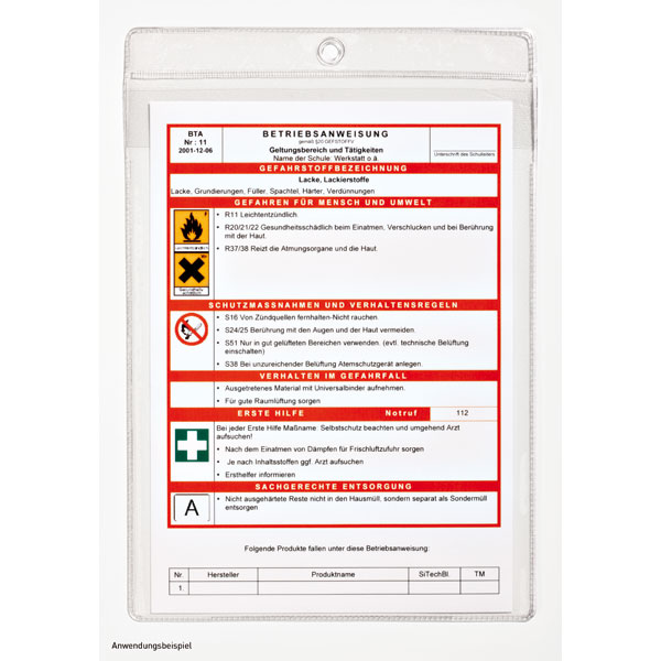 eignen sich ideal für die Unterbringung von Sicherheitshinweisen, Lagerkennzeichnungen, Reperaturzetteln, Telefonverzeichnissen etc.