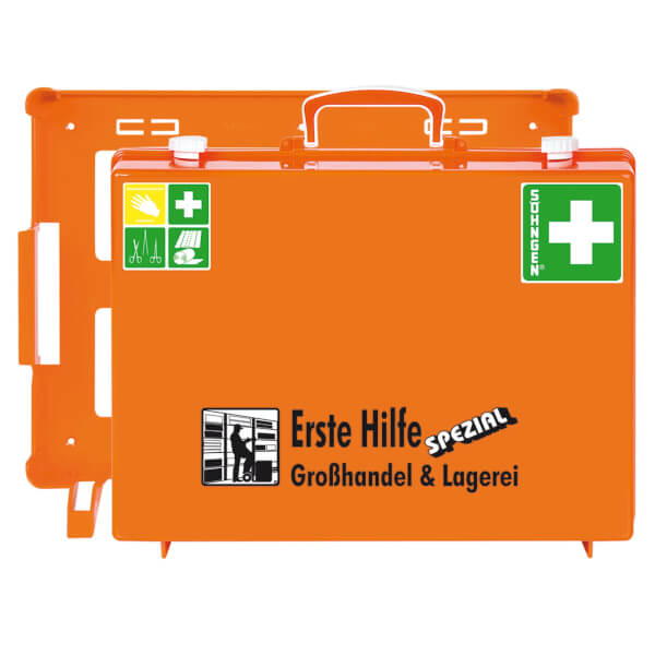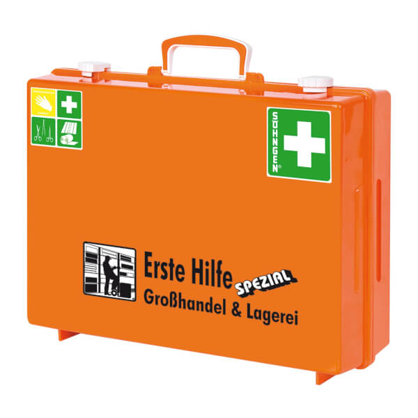 Im Zuge der Arbeitssicherheit muss in jedem Betrieb ein ordnungsgemäßer Erste-Hilfe-Koffer zu finden sein, welcher auf eine allgemeine und generelle Sicherheit ausgelegt ist. Doch für jede Berufsgruppe gibt es zuweilen eigene Risiken und Gefahren. So orientiert sich dieser Erste-Hilfe-Koffer speziell am Großhandel, sodass die dort auftretenden Unfälle noch spezifischer behandelt werden können. Der gesamte Koffer setzt sich nach DIN 13157 zusammen und beinhaltet darüber hinaus weitere, berufsgruppenbezogene Materialien, die zur effektiven Ersten Hilfe beitragen.
