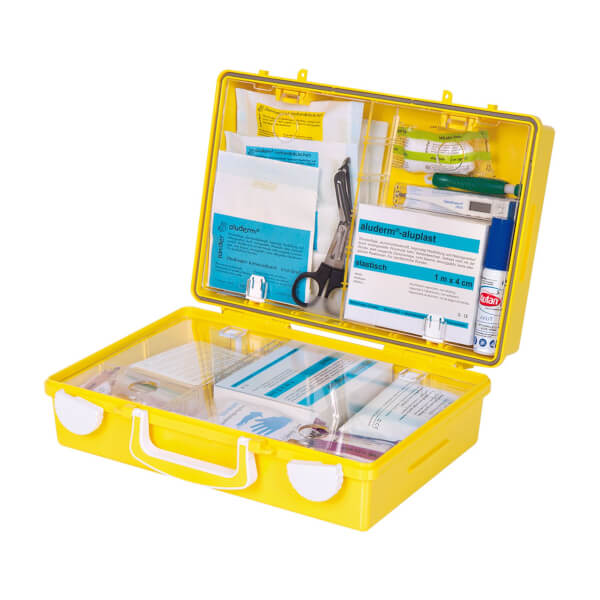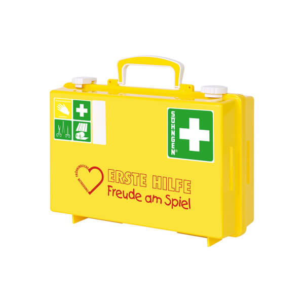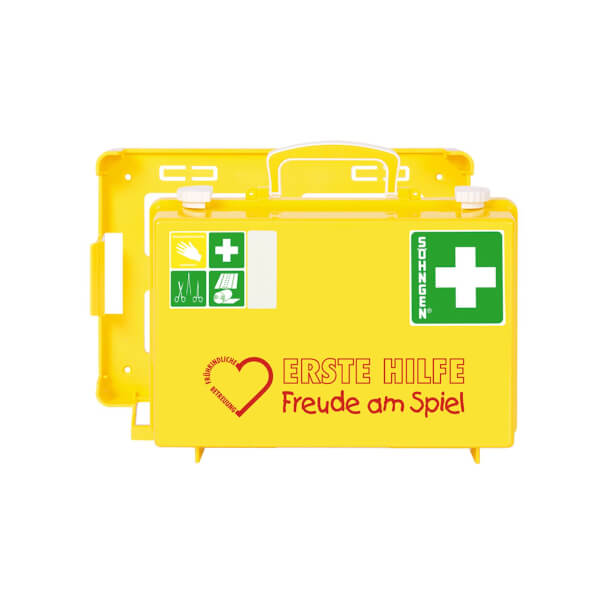 Die Füllung des Erste-Hilfe-Koffers SN-CD gelb - Freude am Spiel - ist mit einer speziellen Füllung für Kinder unter 3 Jahren ausgestattet. Der Koffer ist sowohl für unterwegs als auch den stationären Einsatz geeignet und wird inklusive Wandhalterung geliefert.