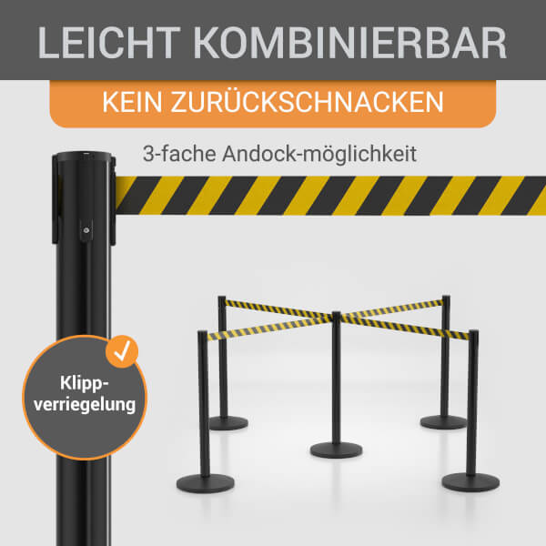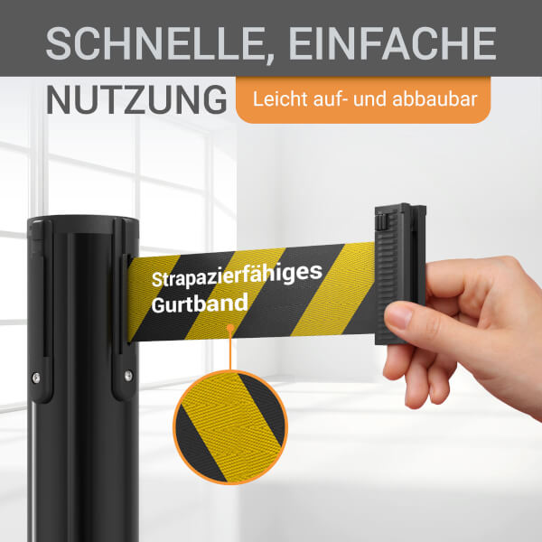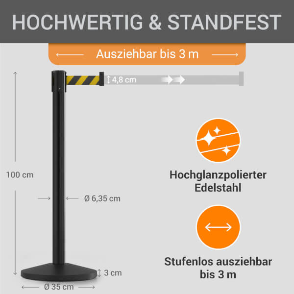 Der hochwertige wolk® Stahl-Absperrpfosten eignet sich ideal für das zuverlässige Absperren und Leiten von Menschenmengen oder abgesperrten Bereichen.