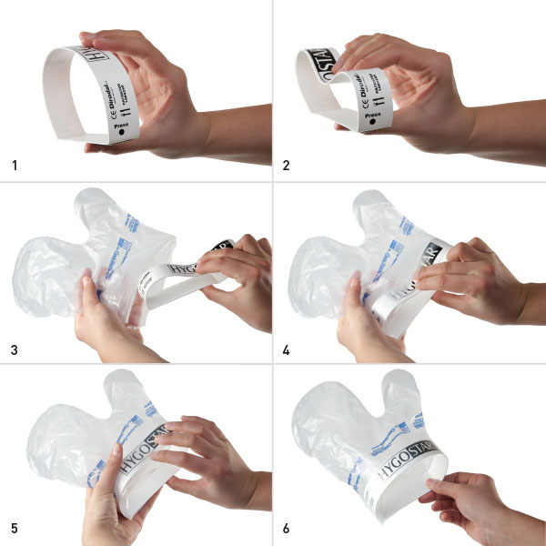Hygiene Set mit Handschuhen und Befestigung für Schürze oder Hosenbund. Der Handschuh kann mithilfe des Rings auf der Halterung fixiert werden.