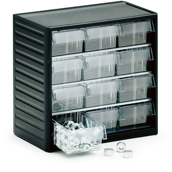 - glasklare Polystyrol-Schubladen mit Etiketten