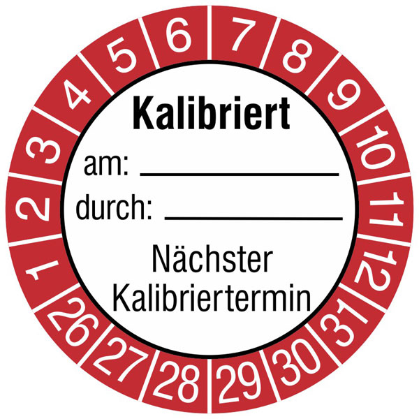 Einsatz Prüfplakette "Kallibriert am: durch:, Nächster Kalibriertermin":