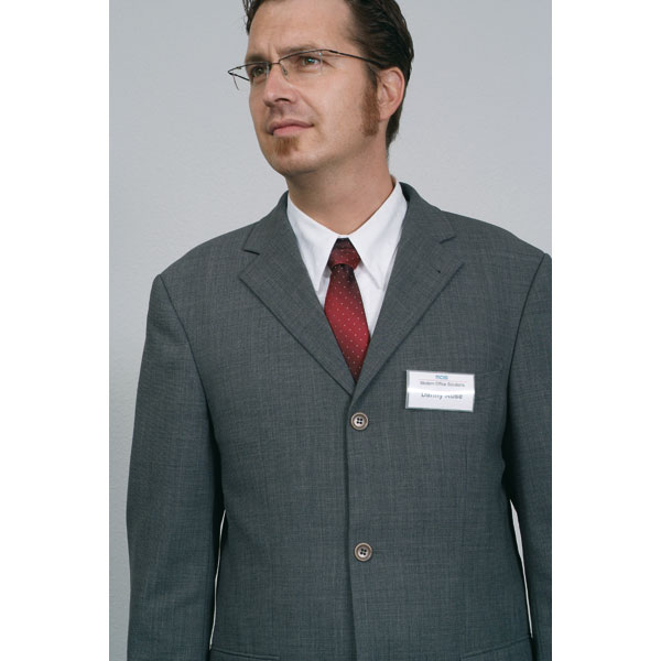 - flexibles Filmscharnier hält die Vorder- und Rückseite des einteiligen Namensschildes zusammen