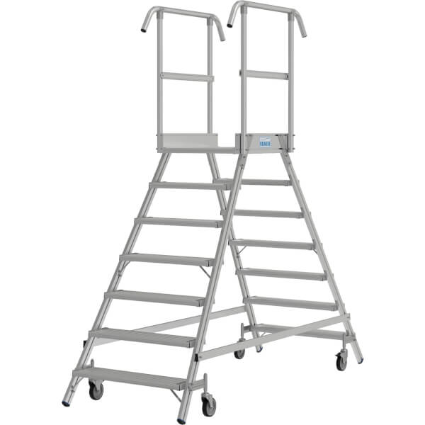 Die KRAUSE® Podestleiter profitiert von einer hohen Mobilität dank schlanker Standbreite und Rollen.