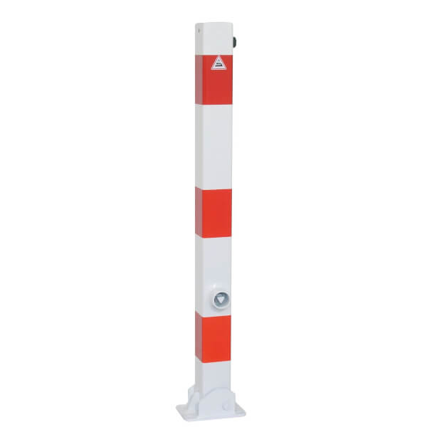 Umlegbarer Absperrpfosten zum Aufdübeln auf Bodenplatte.