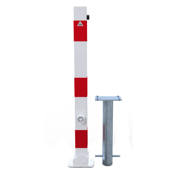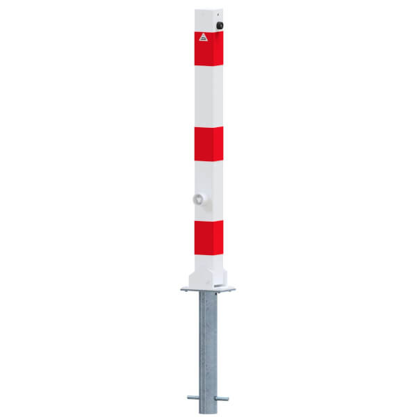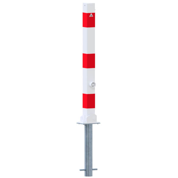 Umlegbarer Absperrpfosten zum Einbetonieren mit Bodenhülse auf Bodenplatte.