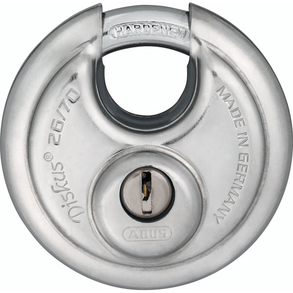 Das Diskus® 26 ist ein besonders robustes Vorhängeschloss für Lkw, Transporter, Kellertüren oder Fabriktore. Mit massivem Innenwerk, gehärtetem Bügel und handverschweißtem Edelstahlkörper bietet es optimalen Schutz gegen Aufbruch-, Bohr- und Sägeversuche.