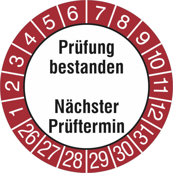 Die Prüfplakette Prüfung bestanden/Nächster Prüftermin ohne wechselnde Jahresfarbe dient der regelmäßigen Kontrolle von Maschinen, Werkzeugen und elektrischen Anlagen. Prüfplaketten bieten die ideale Möglichkeit, Inspektionen zu dokumentieren und Wartungsintervalle aufzuzeigen. Das Jahr, in dem die nächste Prüfung zu erfolgen hat, kann einfach mit einer Kerbzange auf dem roten Rand der Prüfplakette eingekerbt werden. Auf diese Weise ist direkt ersichtlich, wann die nächste gesetzlich vorgeschriebene Inspektion zu erfolgen hat.