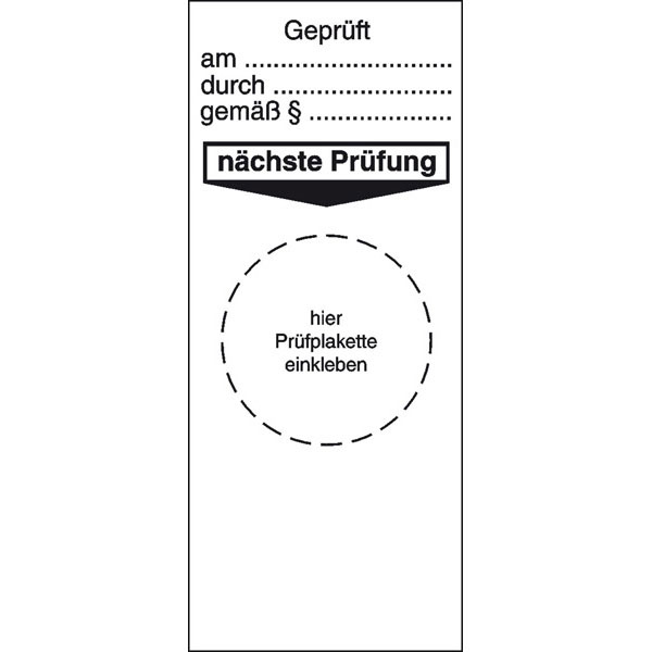 Eine übersichtliche Kennzeichnung hinsichtlich erfolgter Prüfungen an Maschinen, Anlagen oder Geräten leisten Grundplaketten. Denn Grundplaketten bieten genügend Platz, um erfolgte Prüfungen, Inspektionen und Wartungen zu kennzeichnen. Diese Grundplakette besitzt Freifelder zur Beschriftung des Prüftermins und des Prüfungsverantwortlichen. Eine Markierung auf der Prüfplakette gibt an, an welcher Stelle der Prüfaufkleber auf der Grundplakette anzubringen ist. Grundplaketten lassen sich ideal mit Jahres- oder Mehrjahresplaketten kombinieren. Dabei kann die gewählte Plakette derart angebracht werden, dass der Pfeil die nächste Prüfung anzeigt. Bei Folgeprüfungen kann die ungültige Prüfplakette unkompliziert mit einer neuen Prüfplakette überklebt werden. Auf diese Weise ersparen Grundplaketten das lästige Entfernen der Prüfplakette.
