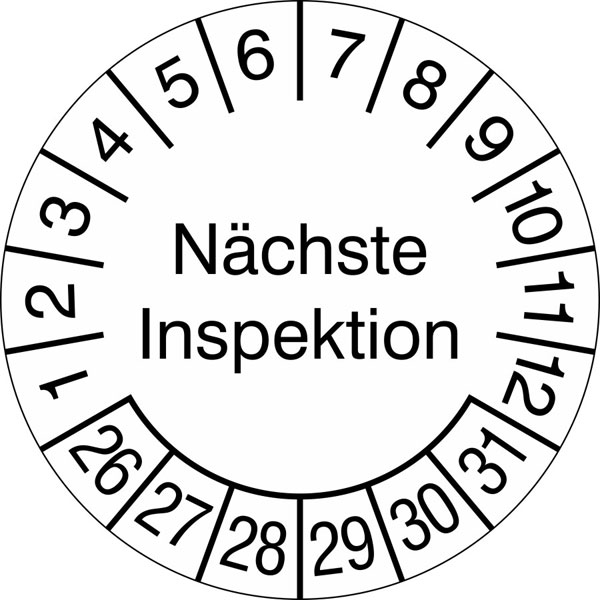Die Prüfung von Elektrogeräten, Anlagen und Betriebsmitteln ist gemäß berufsgenossenschaftlicher Vorschrift Pflicht: Alle elektrischen Betriebsmittel eines Unternehmens müssen regelmäßig auf ihre Funktionstüchtigkeit und Sicherheit überprüft werden. Zur Dokumentation des nächsten anstehenden Prüftermins eignet sich die Prüfplakette Nächste Inspektion. Nicht jede Maschine in einer Betriebsstätte unterliegt demselben Prüfrhythmus, deswegen sollten Prüfplaketten an bereits begutachteten Betriebsmitteln angebracht werden. Dies erleichtert die Zuordnung zum nächsten Prüftermin des jeweiligen Betriebsmittels. Mit dieser Mehrjahresplakette kann über einen längeren Zeitraum hinweg auf Prüf- und Wartungstermine hingewiesen werden. Die Prüfplakette kann unkompliziert mit einem Folienstift beschriftet und der Prüftermin mit einer Kerbzange auf der Plakette eingekerbt werden.