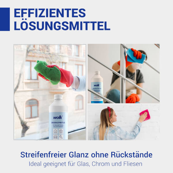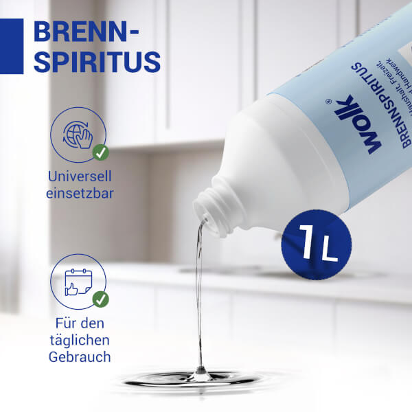 Der hochwirksame wolk® Brennspiritus eignet sich bestens als Alleskönner für Haushalt, Freizeit, Auto und Handwerk.