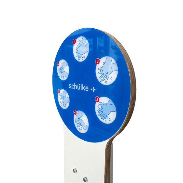 Durch die optisch ansprechenden Piktogramme am Kopf ist jederzeit sichtbar wie Hände richtig desinfiziert werden sollten.